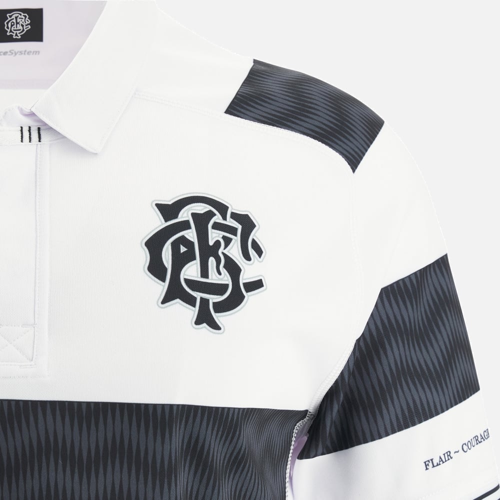 2023/24 replica shirt - traditional white relaxed fit shirt with black hoops inset with a tonal chevron design, pinstripe pattern on the cuffs and under the collar and embroidered club crest.