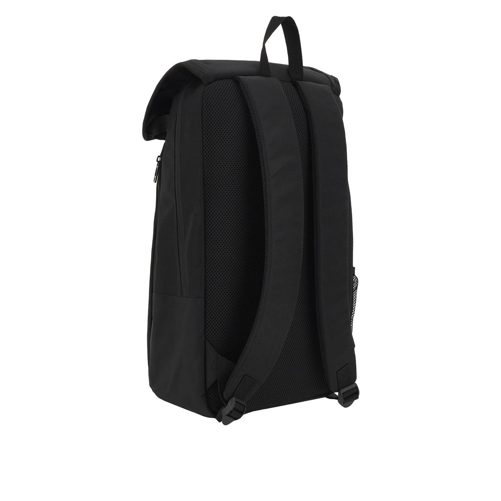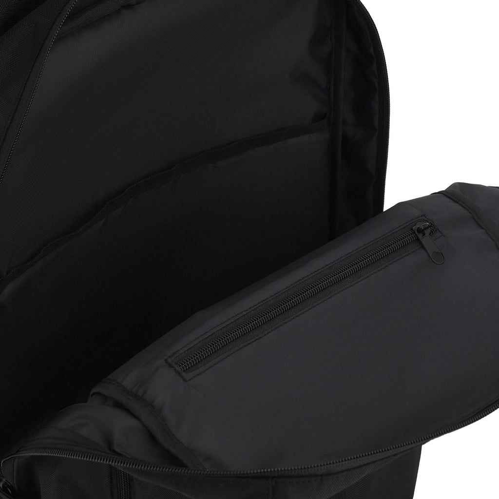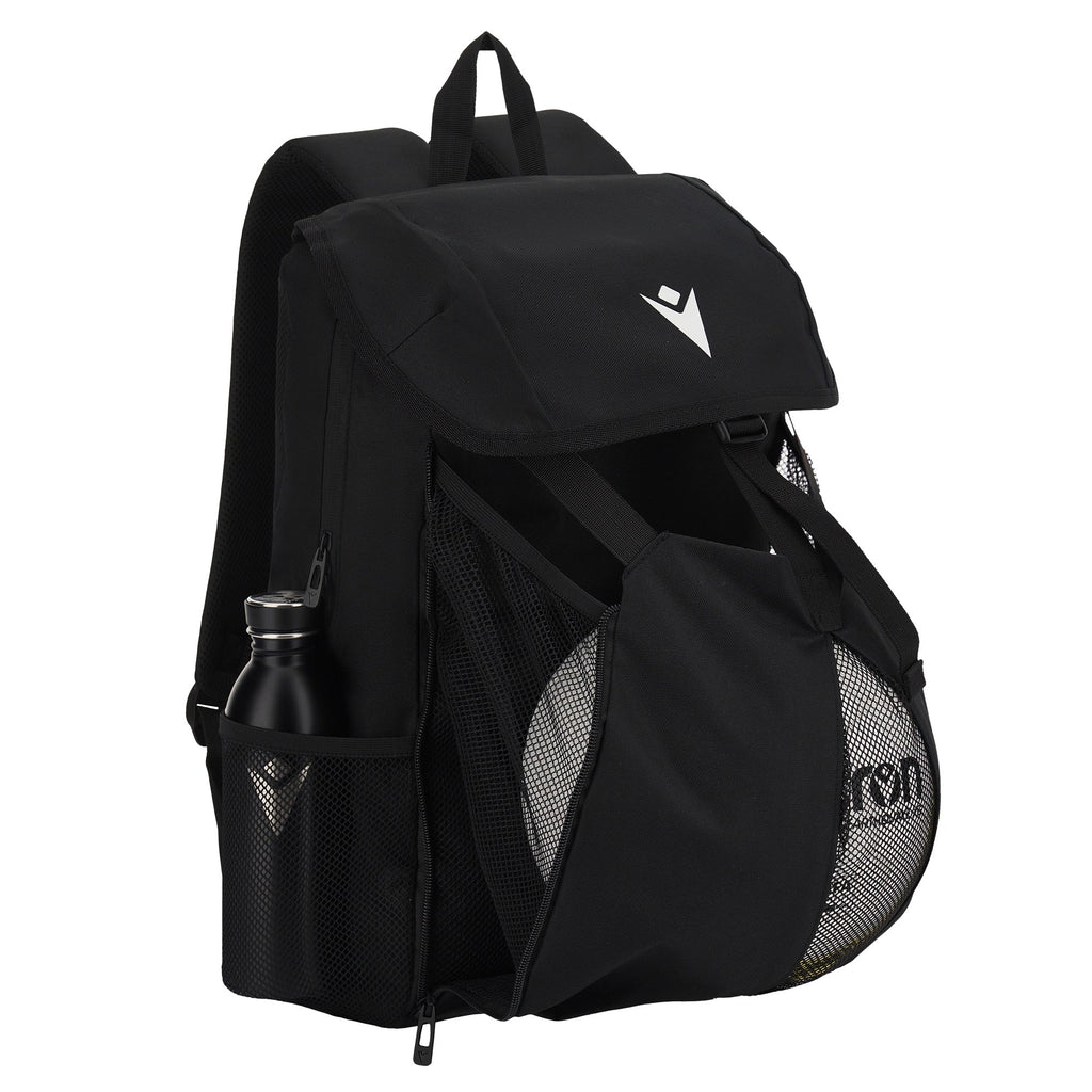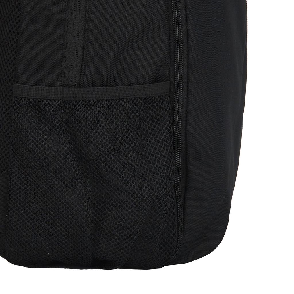 Backpack with large front compartment with zip closure housing an organizer section and laptop pocket. The outside features a front ball pocket in stretch mesh and a side utility or water bottle pocket. The section designed to stay in contact with the back is in padded, breathable fabric for superior comfort.