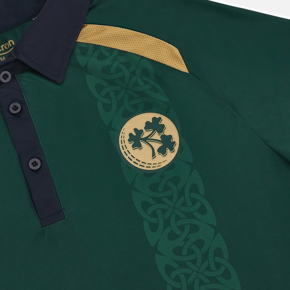 The new 2023/24 ODI shirt of the Ireland Cricket Team features distinctive, traditional graphic motifs. The club badge, with its characteristic Irish shamrock, is heat-pressed over the heart. A band of Celtic knots stretches from the neck to the bottom hem. The pattern is dye-sub printed in different shades of emerald green and embellished with elegant gold details on the front and back.