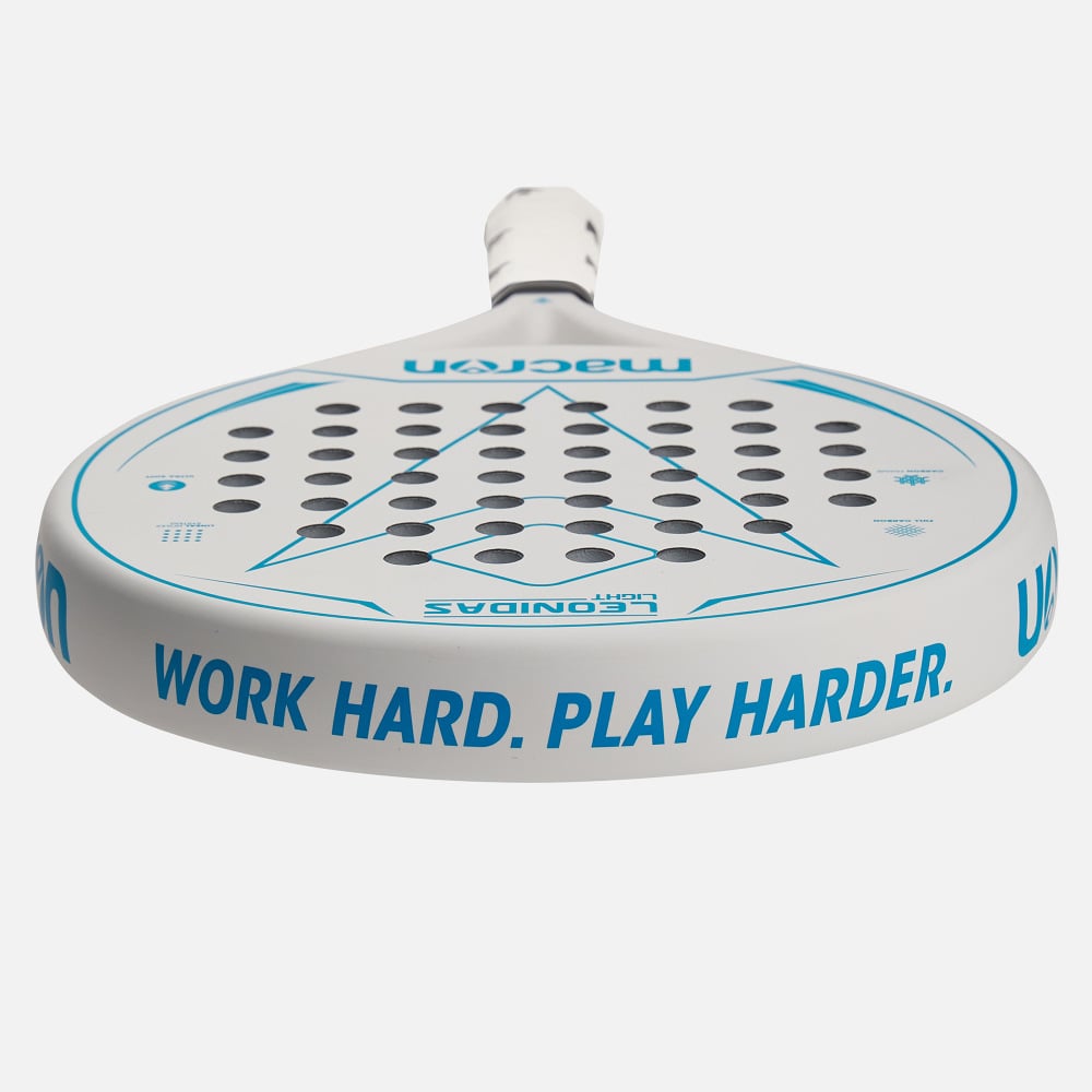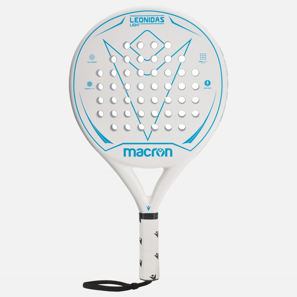 Macron presents the Leonidas Light padel racket. Featuring modern design in shades of light blue and white, it is ideal for regular players who want a high-performance racket, but with a slightly lighter weight for enhanced comfort. This racket delivers serious power along with precision control of the ball.