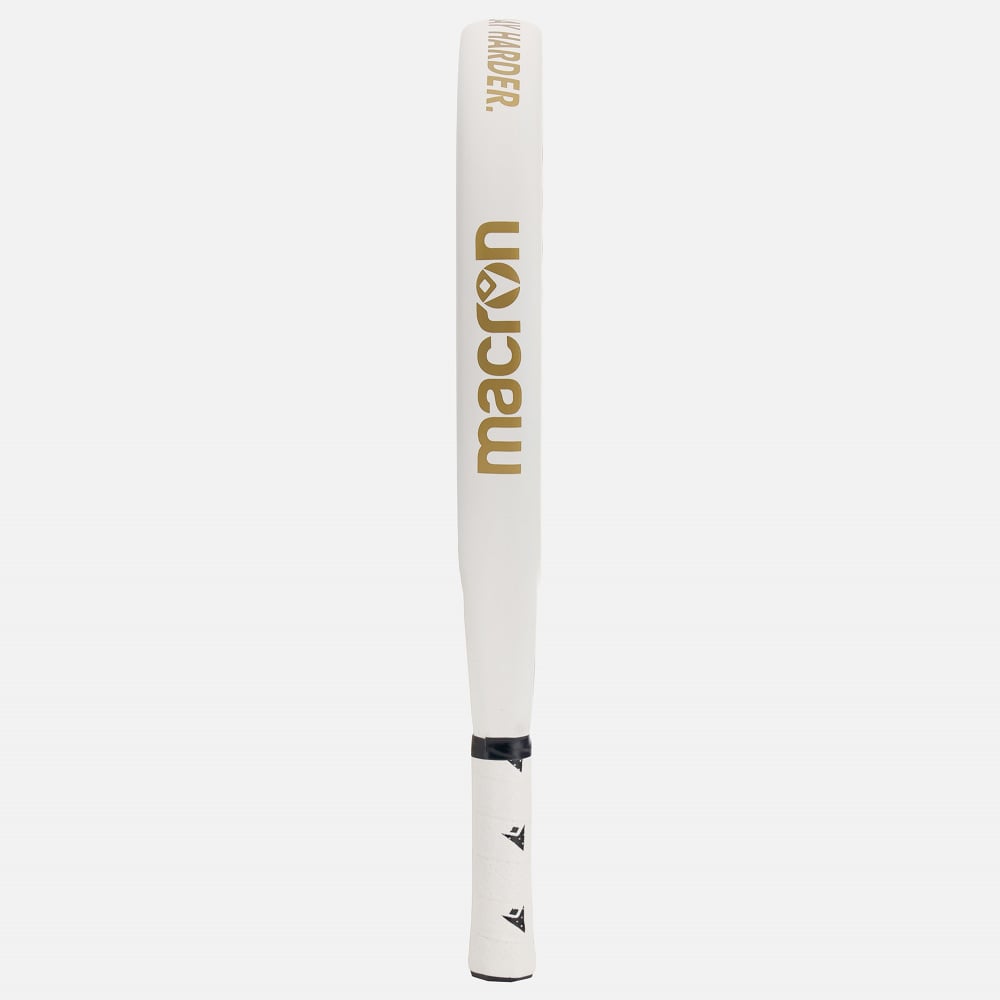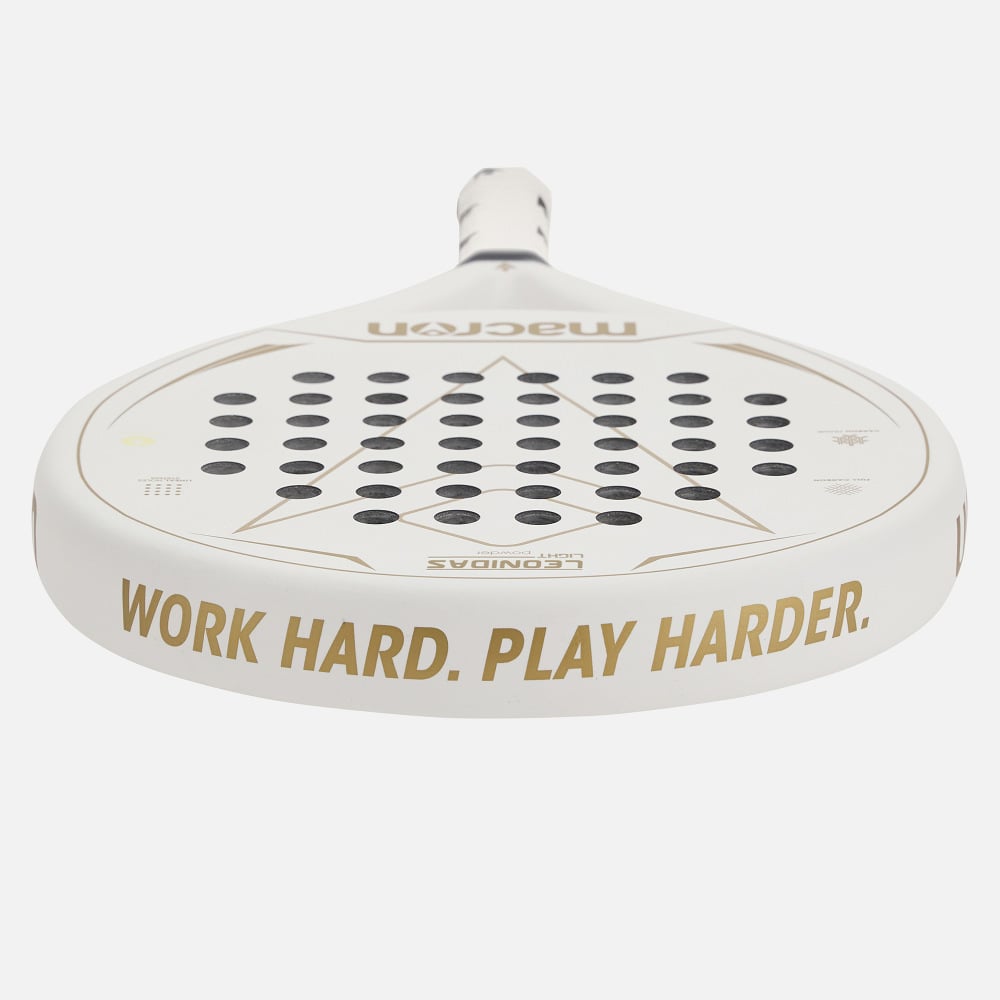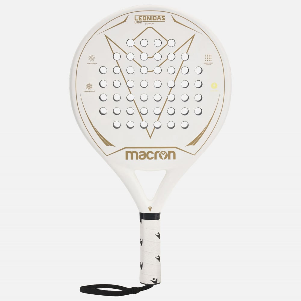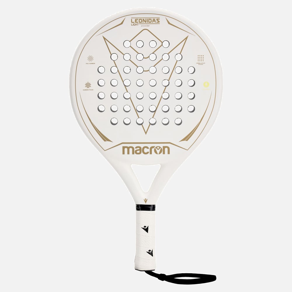 Macron presents the Leonidas Light Powder padel racket. Featuring modern all-white design with gold graphics, it is ideal for regular players who want a high-performance racket, but with a slightly lighter weight for enhanced comfort. This racket delivers serious power along with precision control of the ball.
